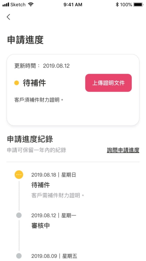 若此次申請需要補相關檢附文件時,審核狀態會顯示為「待補件」,您可點選右方「上傳文件」進行檔案與圖片上傳