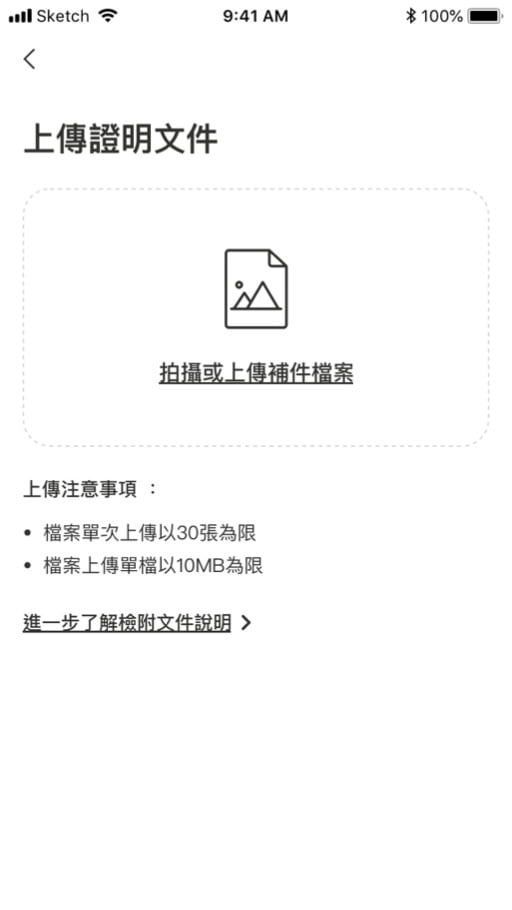 點選補件檔案進行上傳,上傳檔案需注意,檔案單次上傳以 30 張為限,檔案上傳單檔以 10MB 為限。您也可以點選「檢附文件說明」查看相關說明