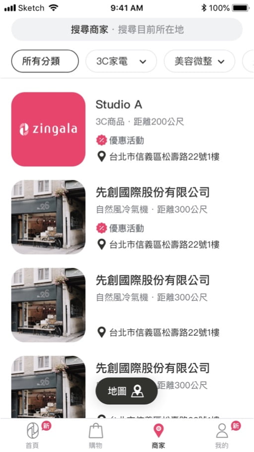 - 地圖顯示:點選商家下方「地圖」圖示,可切換以地圖方式顯示商家,再次點選回復條列式顯示