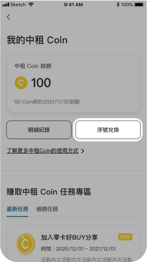 點選zingala銀角零卡APP首頁「中租Coin」,再點選「序號兌換」