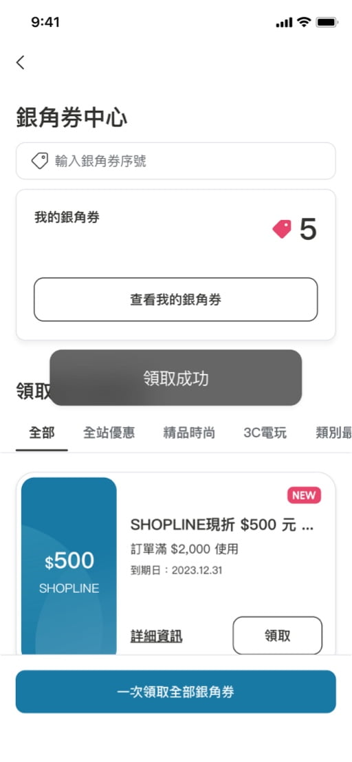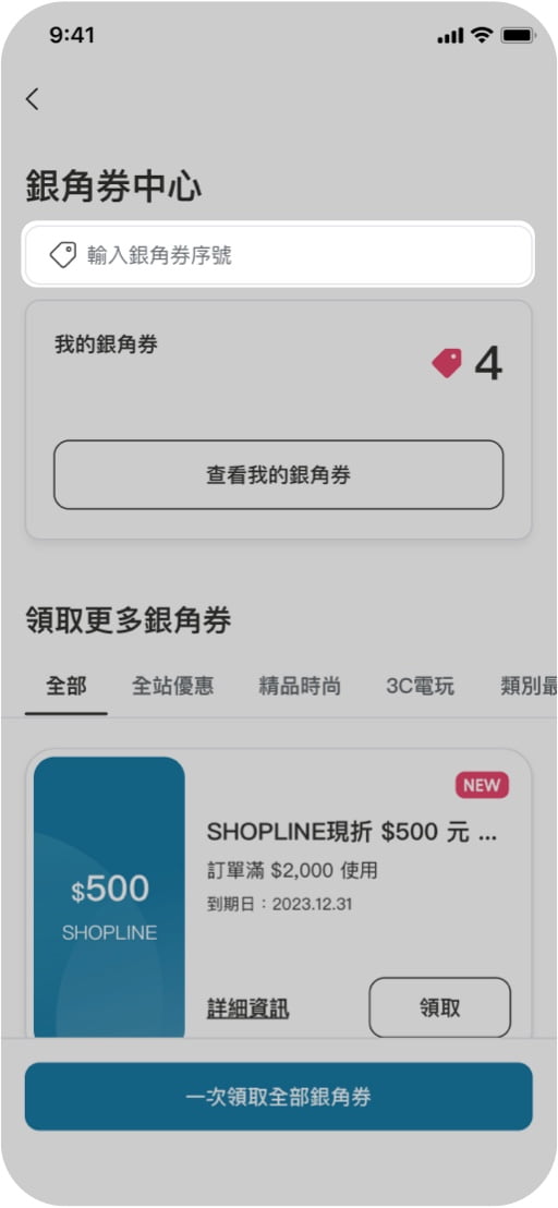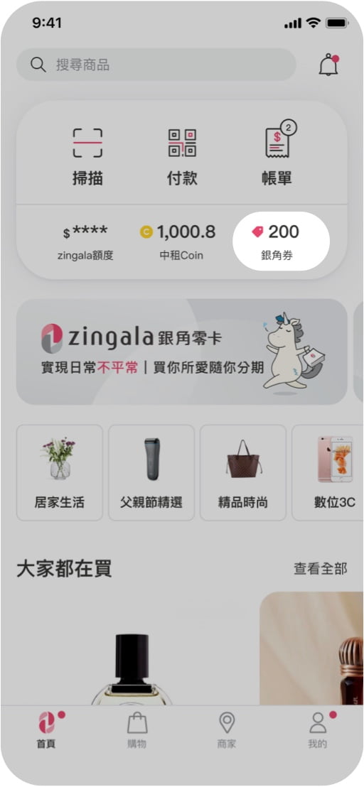 可直接從首頁點擊「銀角券」、或是點擊「我的」後,再選擇「銀角券中心」進入銀角券中心頁。