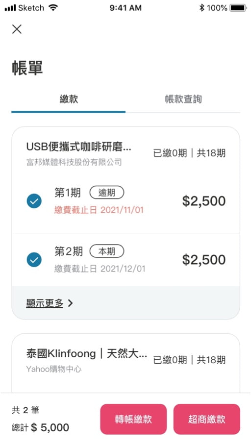 可一次勾選多筆消費、多期帳單。若合併繳款,僅收取一筆轉帳手續費,也可於此勾選逾期繳款,進行補繳