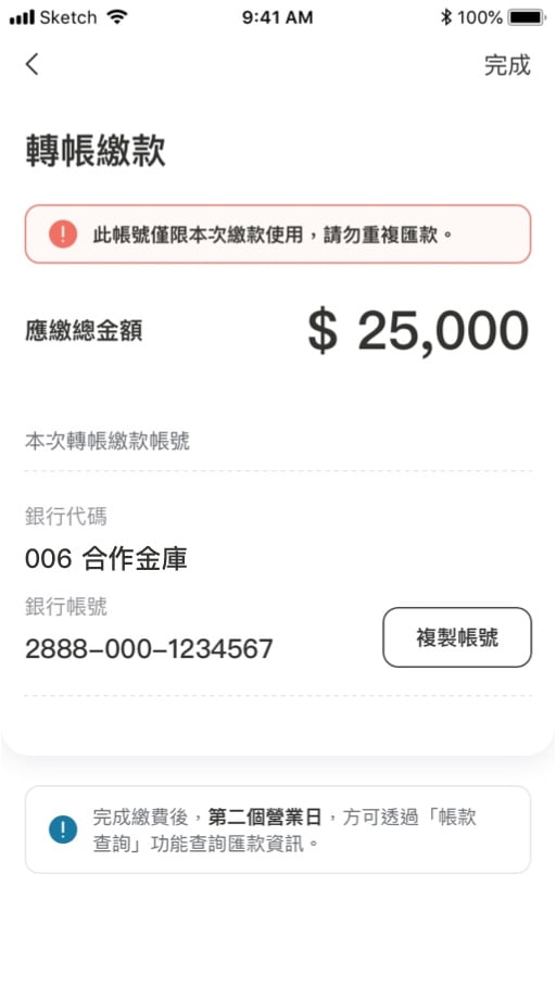 點選「複製帳號」於網路銀行轉帳繳費,或至實體 ATM 轉帳。完成繳費後第⼆個營業⽇,⽅可透過「帳款查詢」功能查詢帳務