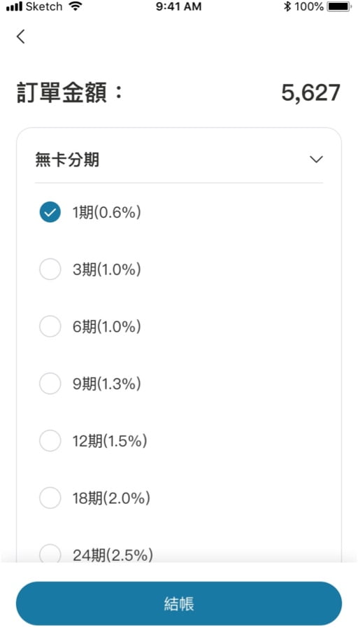 結帳流程的付款方式選擇銀角零卡 (無卡分期),選擇後支付或分期付款之期數,並確認總價與期付款金額,送出訂單